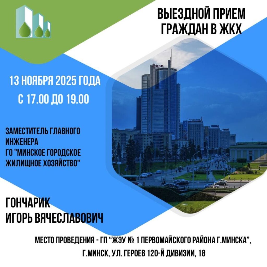 13 ноября 2025 года на базе ГП «ЖЭУ № 1 Первомайского района г.Минска» (ул. Героев 120-й дивизии, 18) выездной прием граждан и юридических лиц проведет заместитель главного инженера ГО «Минское городское жилищное хозяйство» Игорь Вячеславович ГОНЧАРИК.