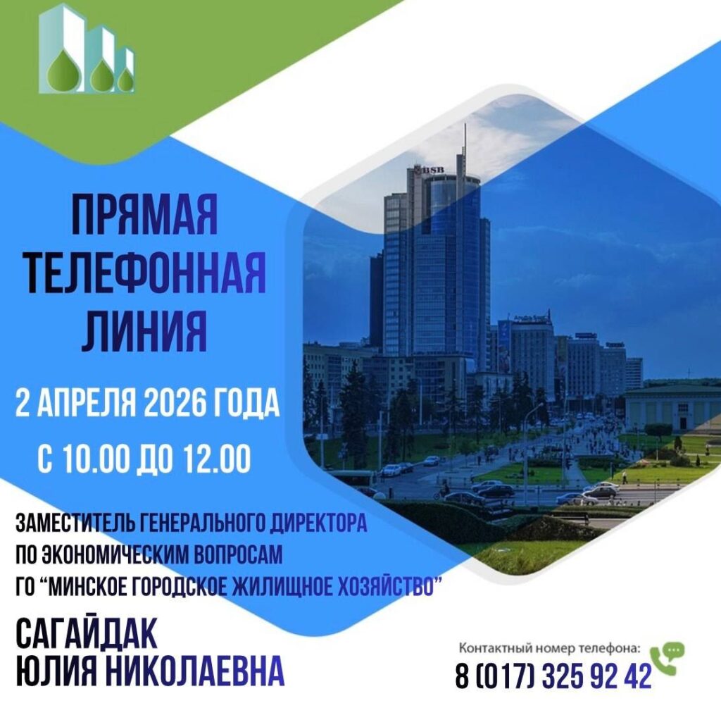 2 апреля 2026 года с 10.00 до 12.00 «прямую телефонную линию» проведет заместитель генерального директора по экономическим вопросам ГО «Минское городское жилищное хозяйство» Юлия Николаевна САГАЙДАК.